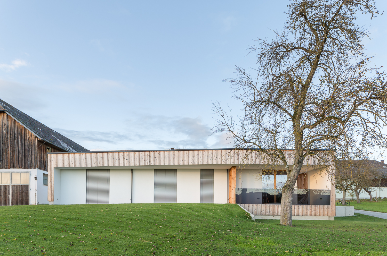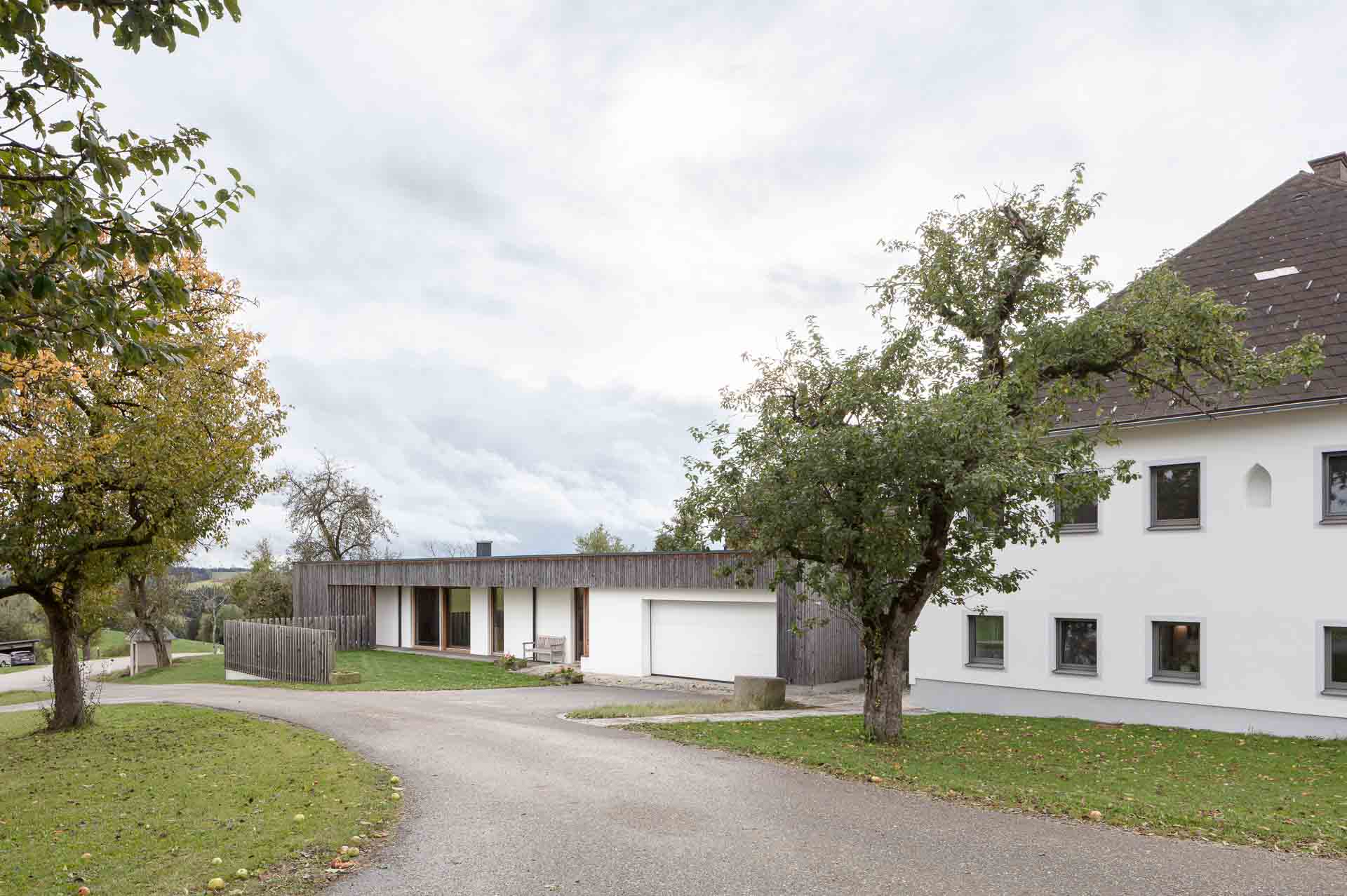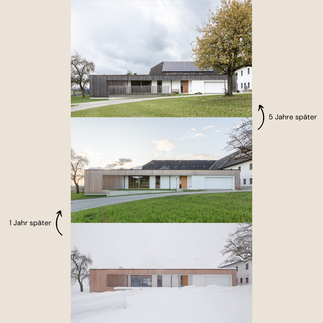 In Etwa 1 Jahr später wird sichtbar wie das Lärchenholz an der Fassade nach und nach vergraut. Langsam fügt es sich immer harmonischer in sein Gefüge am Hof ein.