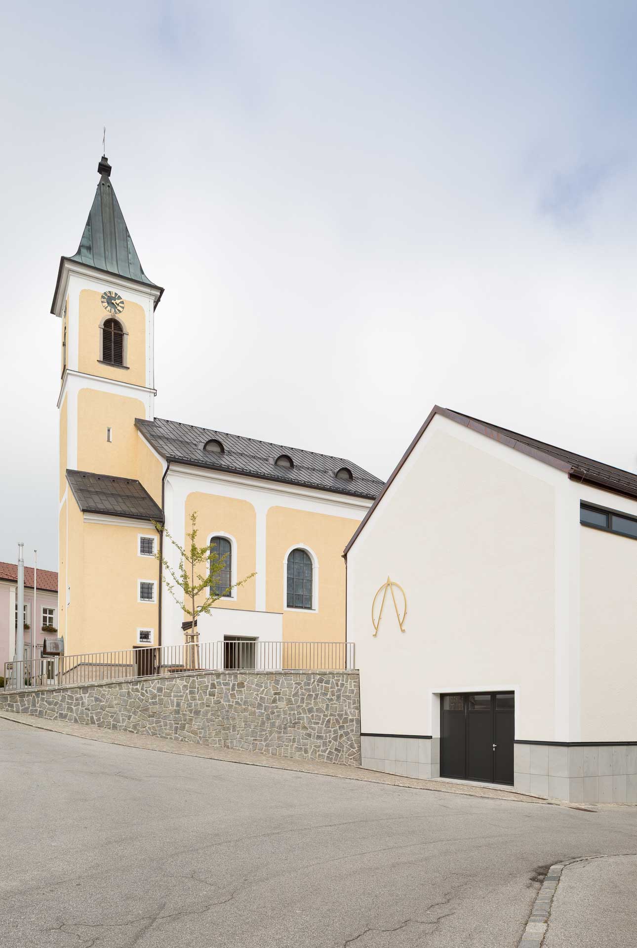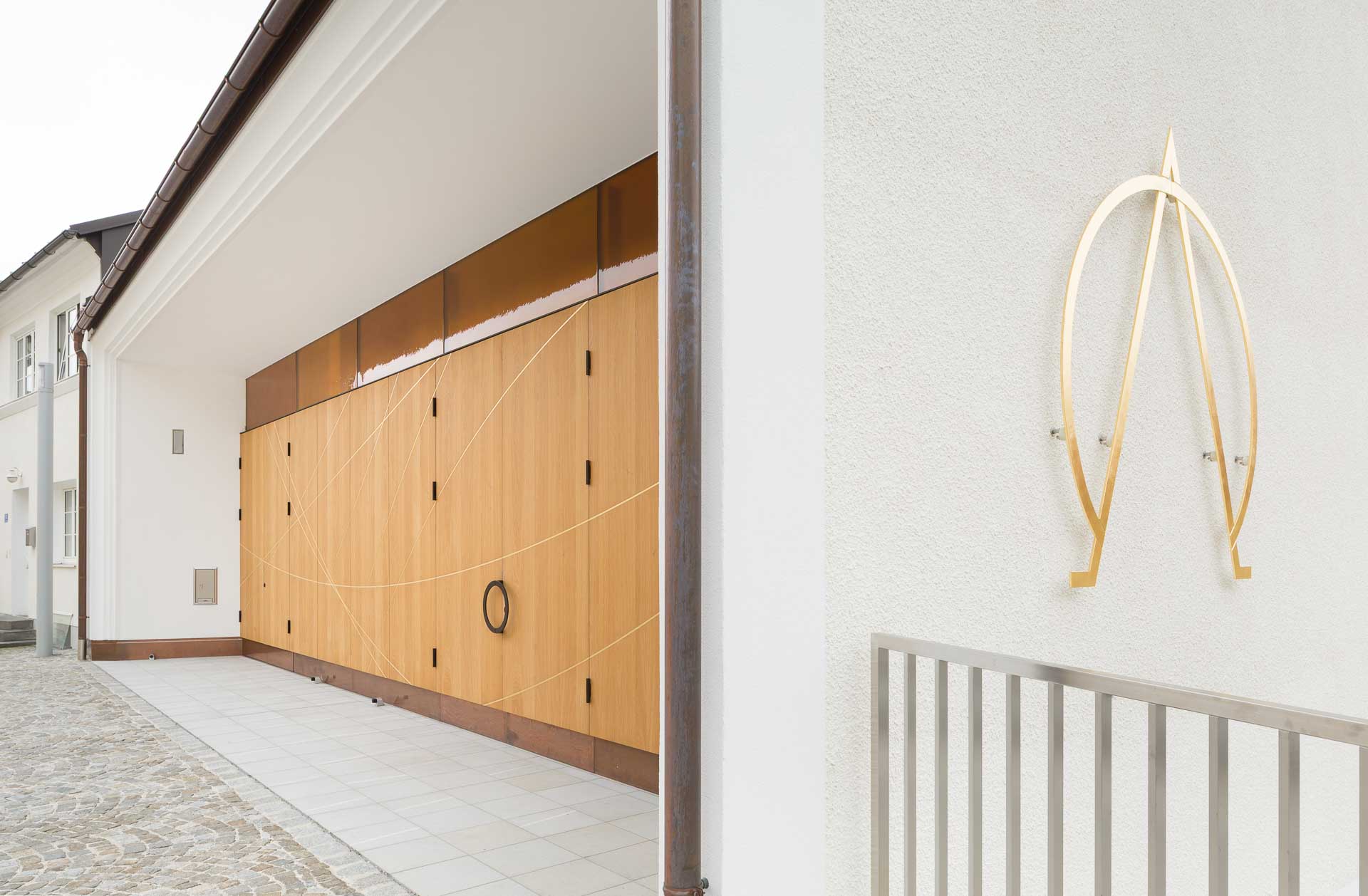 Auf der Giebelseite prangt ein großes goldenes Symbol.