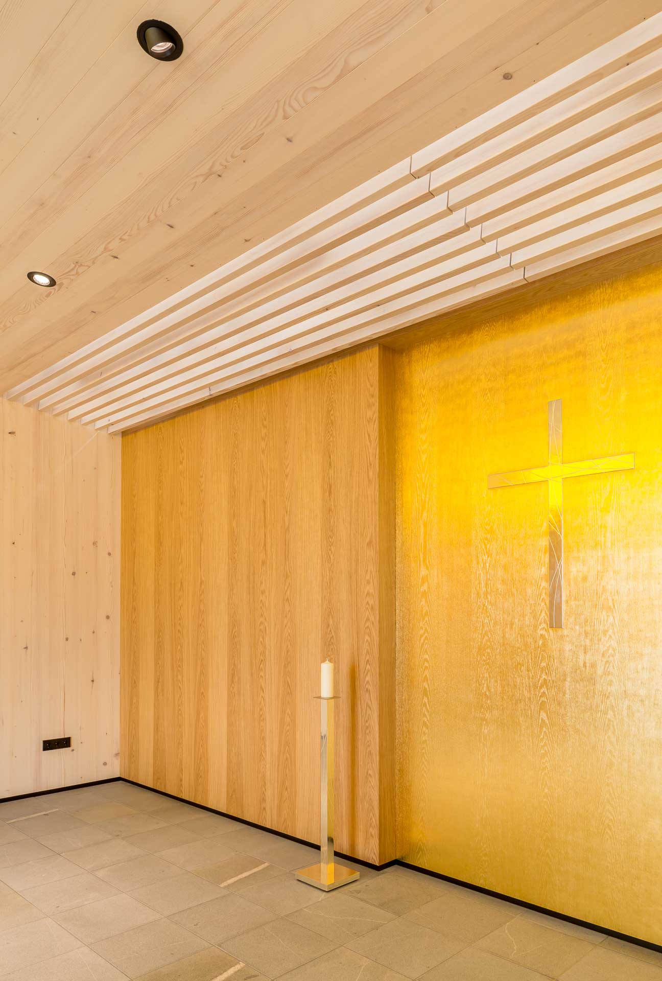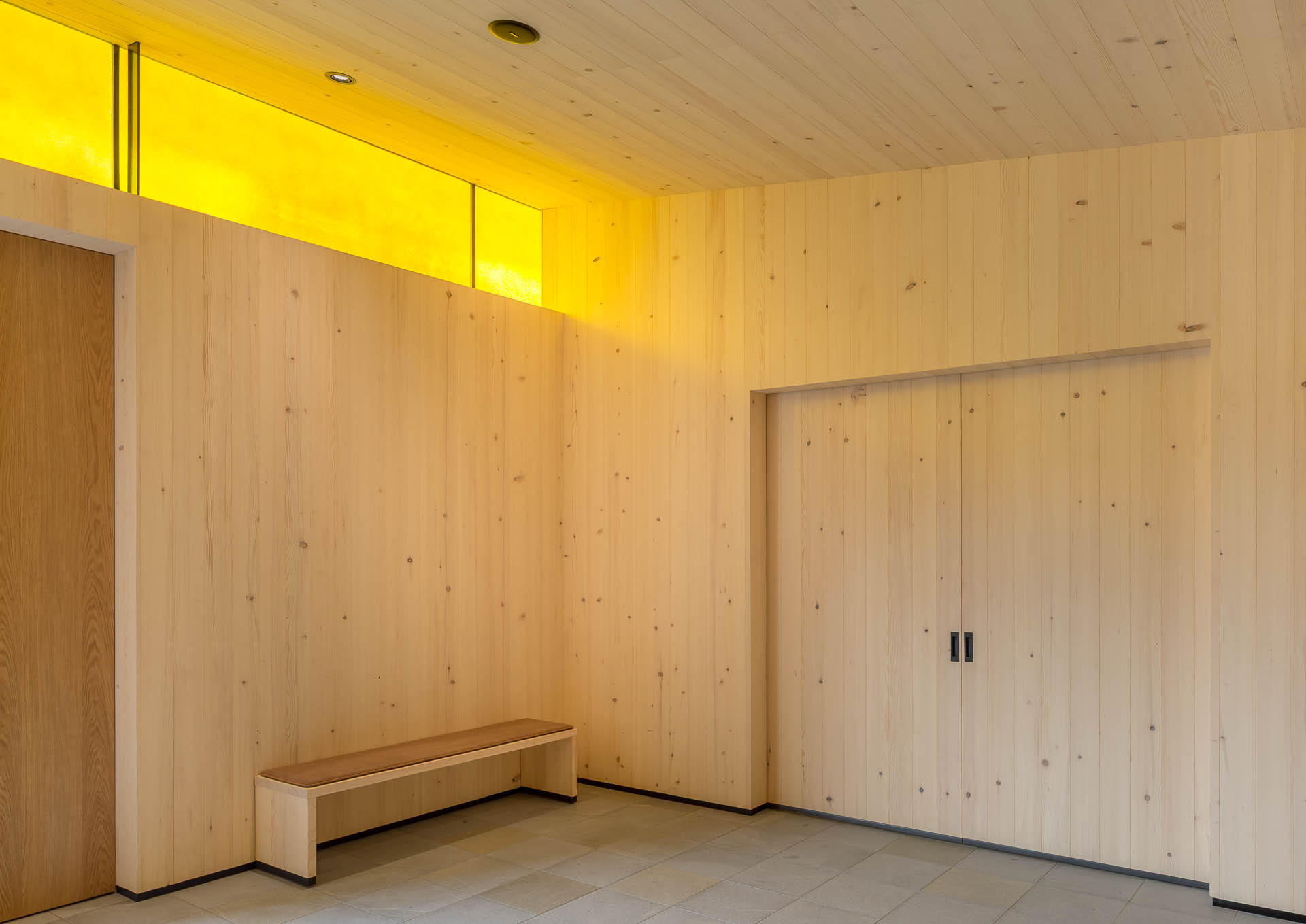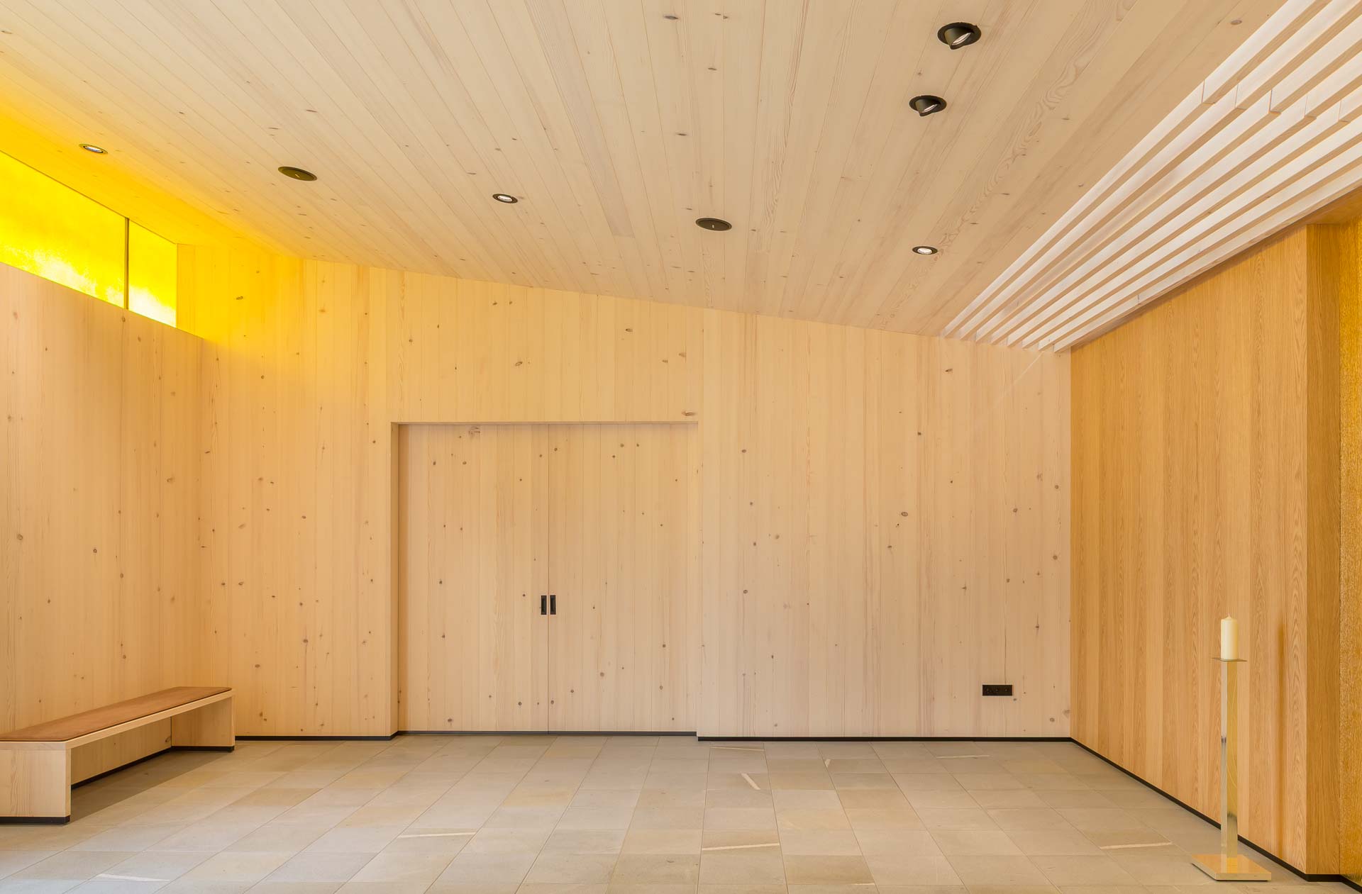 Im Inneren des Verabschiedungsraums sorgt die Oberlichte aus gelbem Glas für eine warme, angenehme Atmosphäre. Genau gegenüber liegt eine in gold lackierte Holzoberfläche, die das gelbe Licht wunderschön reflektiert. Der Rest des Innenraums ist recht ruhig und strukturiert gehalten.