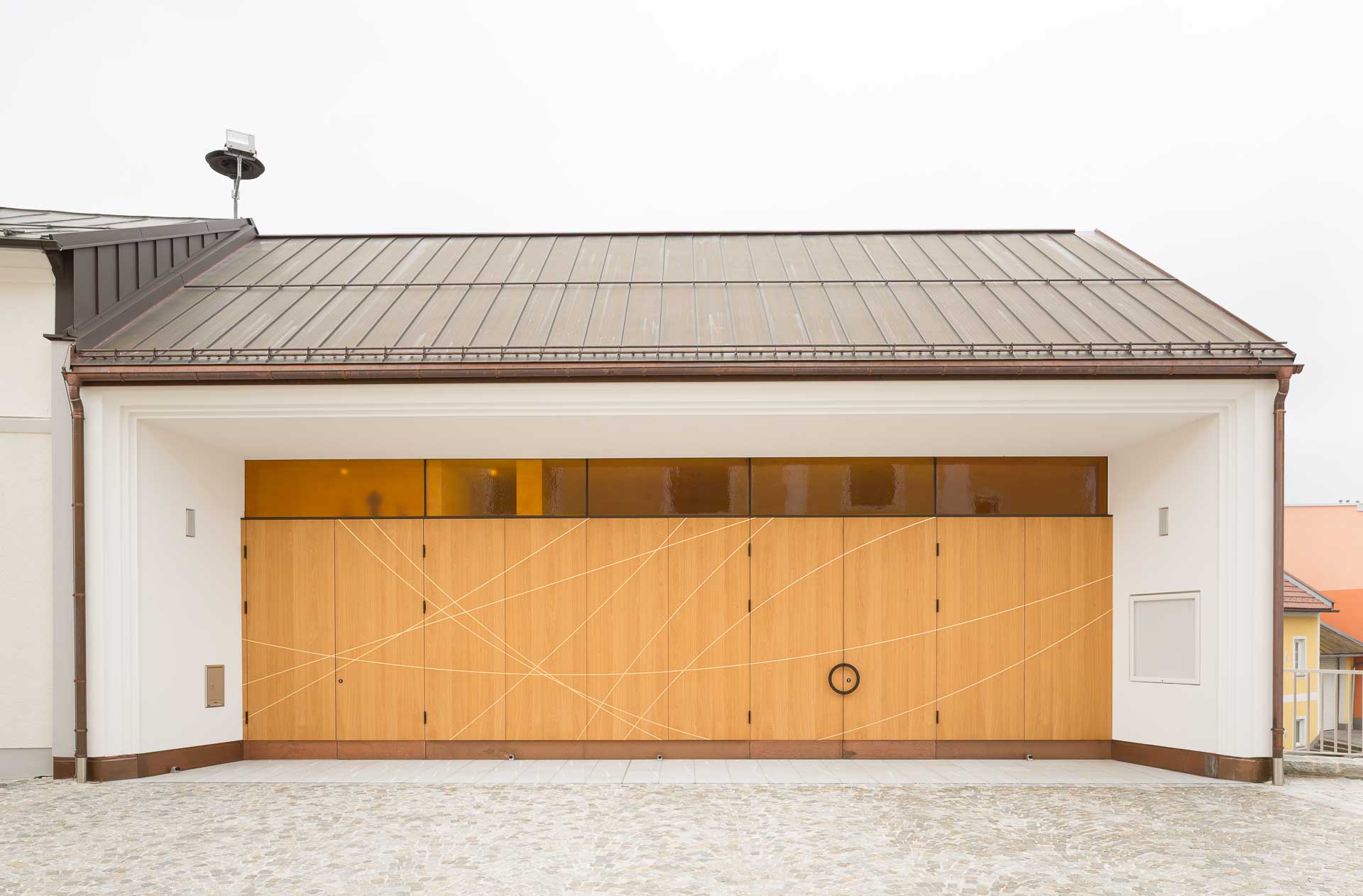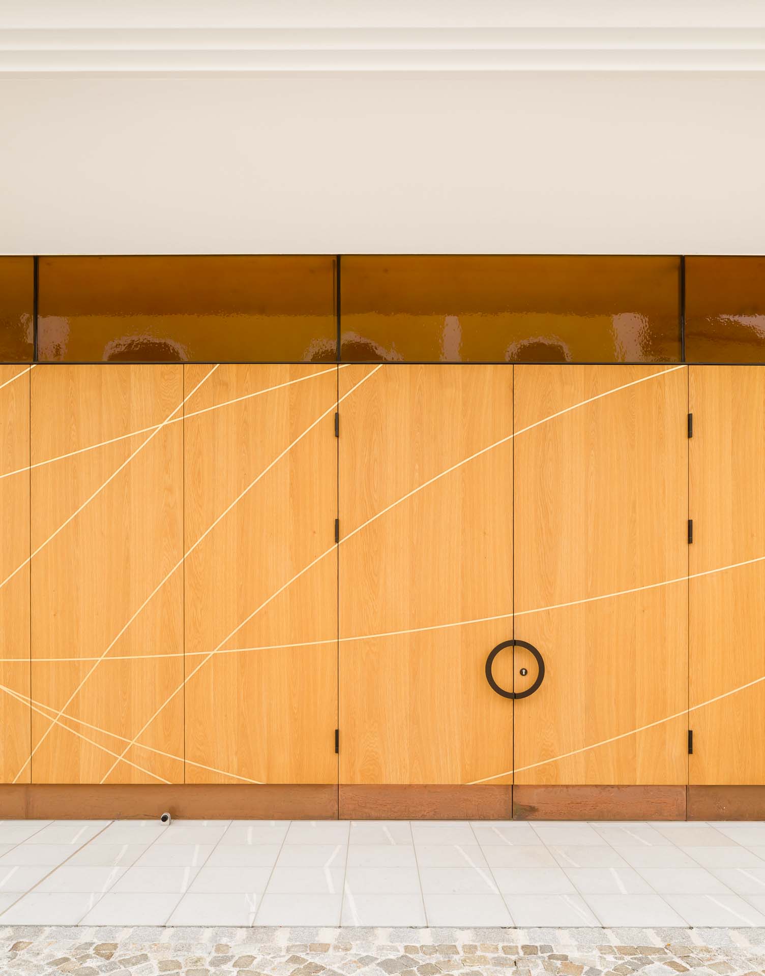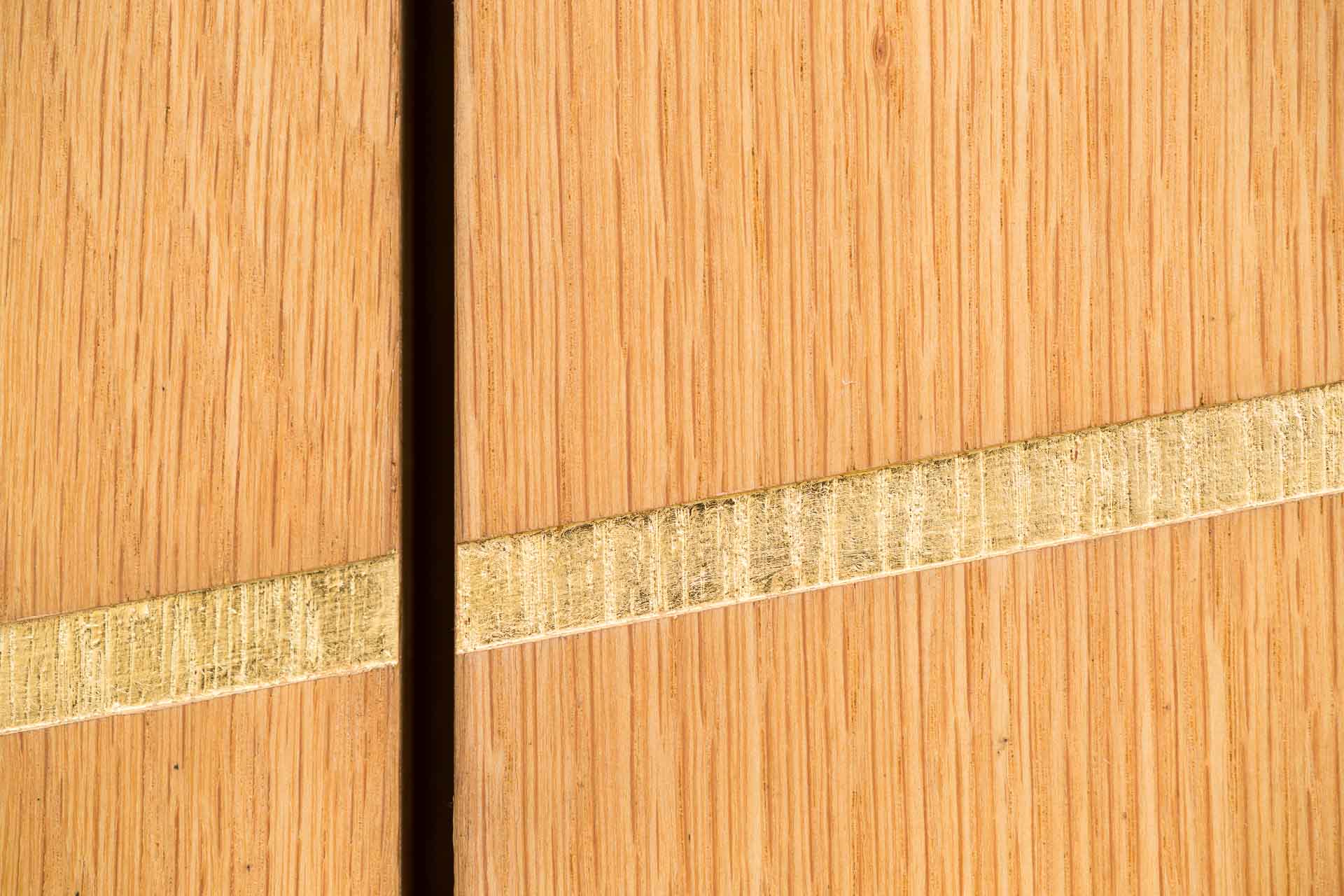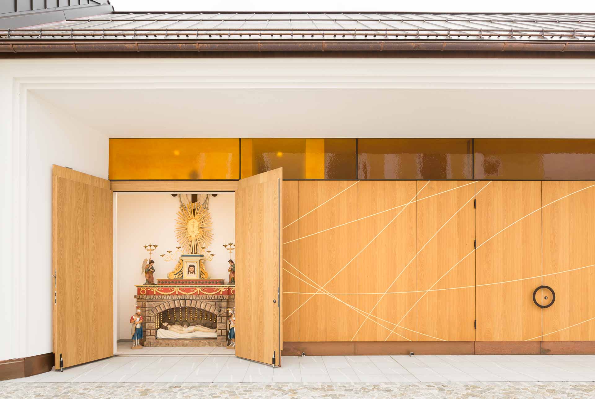 Im Inneren des Verabschiedungsraums sorgt die Oberlichte aus gelbem Glas für eine warme, angenehme Atmosphäre. Genau gegenüber liegt eine in gold lackierte Holzoberfläche, die das gelbe Licht wunderschön reflektiert. Der Rest des Innenraums ist recht ruhig und strukturiert gehalten.